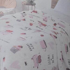 Features pink and red cupcake, hot chocolate, hearts and strawberry designs on a white background.
