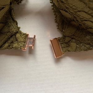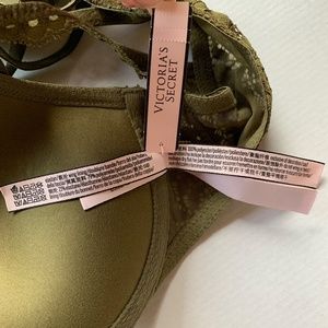 New With Tags, never worn Victoria's Secret push-up bra in olive green. Lacy detailing on cups and adjustable racerback straps. Easy to use front closure. Sexy and sophisticated, from the Dream Angels collection.