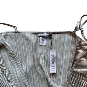 Make a statement with this stunning Victoria's Secret Metallic Rose Gold Crop Tank Camisole. The pleated shine fabric offers a unique, luxurious texture that catches the light beautifully. Whether you’re dressing it up for a night out or pairing it with jeans for a chic daytime outfit, this top is a versatile must-have in your wardrobe.