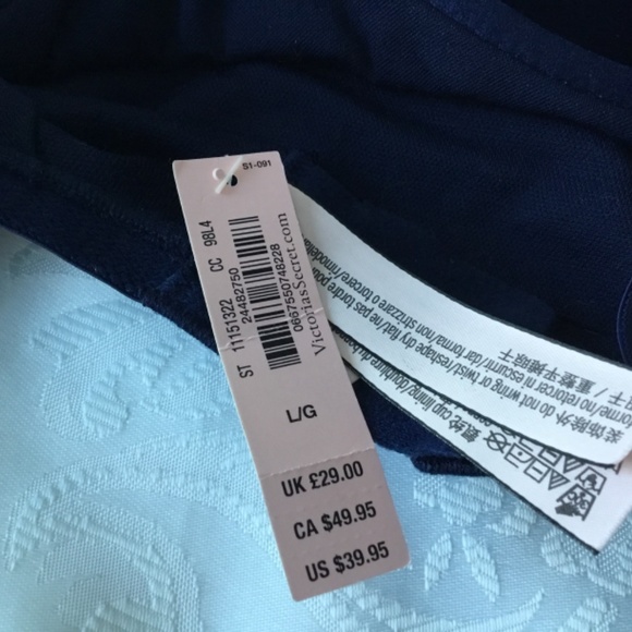 Size Large, Navy Blue with White Victoria Secret Logo on front of bra and straps.
