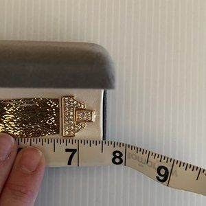 A vintage Nolan Miller gold tone bracelet that has never been worn and lovingly stored in its original box. Comes with certificate of authenticity. Measures approximately 7.5" long and 3/4" wide.