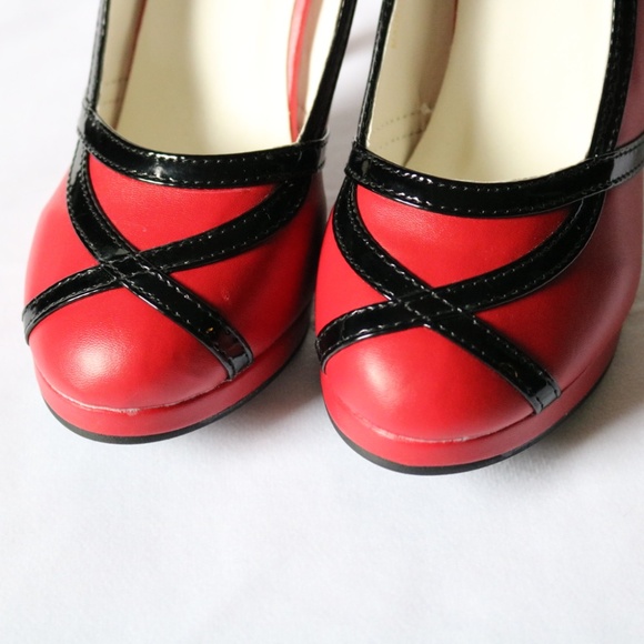 NWT Cute retro inspired red and black heels with slight platform. Made by Get More Beauty, all man-made materials and shoes feature an ankle strap closure. Women's size 38 (US 7.5). Pre-owned but never worn and like-new. Smoke-free, pet friendly home!