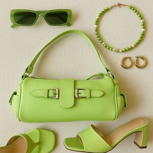 Turn heads with this rare vintage chartreuse Zaraz Couture shoulder bag, a Y2K gem that channels all the early 2000s charm. This structured baguette-style purse features silver-tone buckles, front flap detailing, and side pocket accents. It closes securely with a top zip and has a roomy interior with both a zip and slip pocket for essentials.