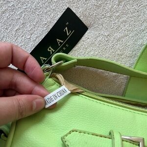 Made from faux leather in a bold lime green hue, it’s an eye-catching statement piece that’s perfect for spring and summer styling. Original tags still attached (style PFB01, distributed by Heys International). Made in China.