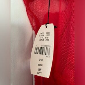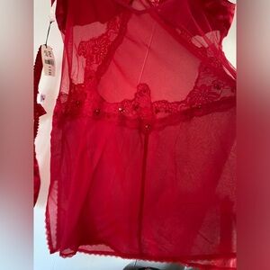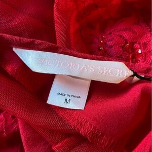 Brand new with tags. Y2K vintage pink tag Victorias Secret set. Babydoll slip dress trimmed in lace, beads and sequins. Side slits. Red silk with sheer accent panels at the sides and back. Opaque material at the bodice. Adjustable straps. Includes matching thong. Both size medium.