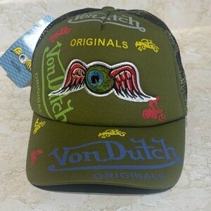 NWT Vintage Y2K Von Dutch Flying Eyes Olive Green Trucker Hat OSFA