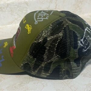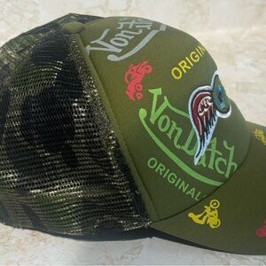 Stylish olive green trucker hat. Features Von Dutch logo and colorful embroidery. Perfect for casual wear.
