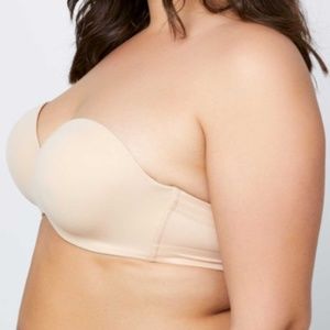This is a substantial bra: attachments for straps (not included) for multiple wearing options; underwire and light molded padding, wide elastic (2) on band as well as silicone strips; side plastic stays (boning). You won't find a better bra for this size in a strapless - it has everything!!