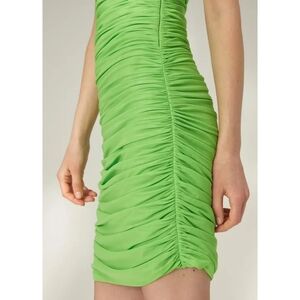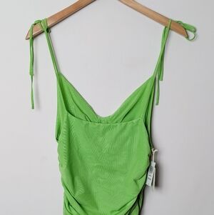 This is a ruched bodycon dress with a triangle neckline and self-tie straps. It's made with soft, stretchy mesh fabric that hugs the body. This version comes in a checkered print that was designed in-house.