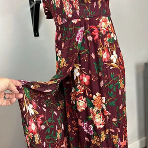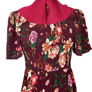 Warm florals on a burgundy background, front crossover skirt, shirred bodice, unlined.