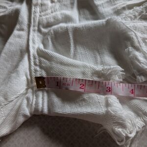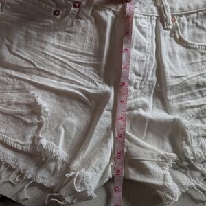 Embrace a laid-back summer vibe with these We The Free white jean shorts, featuring a chic distressed hem and a high-waisted fit. The clean white denim offers a fresh and versatile look, perfect for sunny days. With a raw cut-off edge, these shorts are designed for a relaxed and stylish appearance.