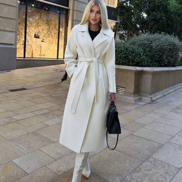 Elevate your cold-weather wardrobe with this stunning white wool coat. Crafted with a luxe, soft-touch wool blend, it features a long, elegant silhouette, structured lapels, and a flattering tie belt that cinches the waist beautifully. Classic black buttons at the cuff add a refined touch. Perfect for both everyday sophistication and special occasions.