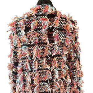 Unique and playful Wild Flower longline cardigan featuring multicolor textured fringe throughout. The black base is woven with vibrant yarns in shades of pink, orange, turquoise, metallic silver and cream, creating a dimensional, bohemian-inspired look. A cozy yet statement piece perfect for layering year-round. Chanel look a like