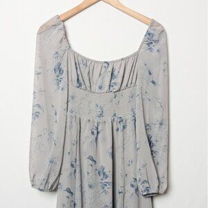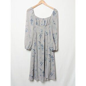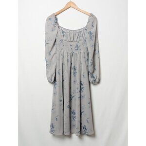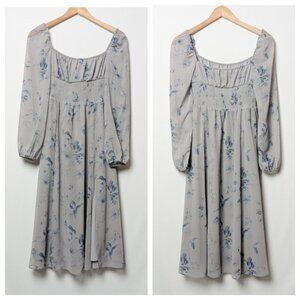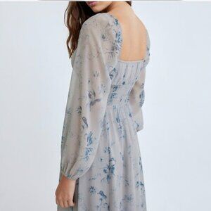 This is a square-neck midi dress with a smocked waist and puff sleeves. It's made from lightweight semi-sheer chiffon.