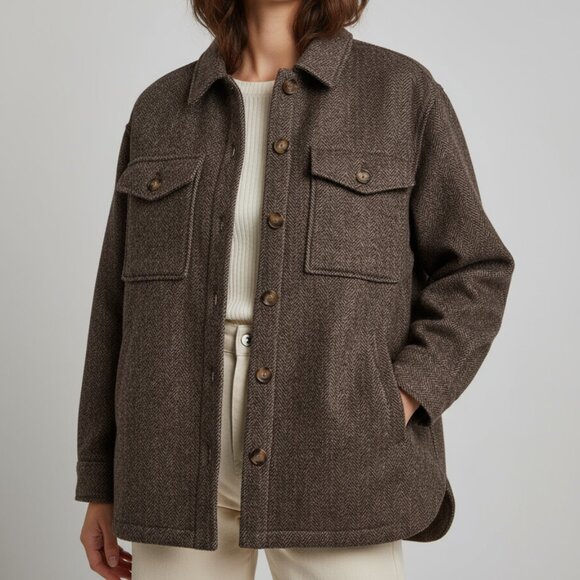 NWT Women's Brown Herringbone Shacket Tweed Style Side Pockets Horn Buttons L