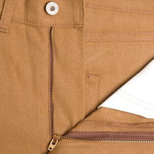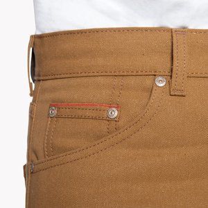 The Duck Canvas Selvedge is a 10oz Japanese Selvedge canvas woven on vintage shuttle looms in a tightly woven plain weave construction. Used primarily for workwear because of its strength and durability, the fabric also has a relatively smooth surface making it less prone to snagging and tearing. Duck canvas was once the fabric of choice used to make jeans before denim became popular in the late 1800's. Other details include, tonal stitching, tan leather patch, red selvedge ID, silver metallic buttons and rivets. The Classic is a straight fit; high rise, fitted around the hips, fuller in the thigh that falls to a wide leg opening.