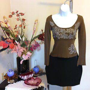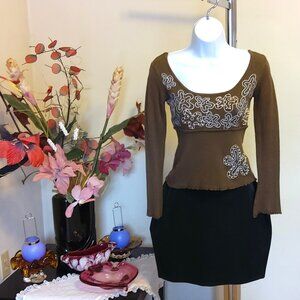 NWT Women’s Scoop Neck Long Sleeve Brown Embroidered Cardigan Sweater XS S
