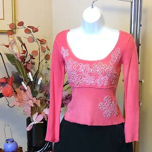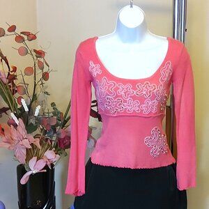 NWT Women’s Scoop Neck Long Sleeve Pink Embroidered Cardigan Sweater XS S