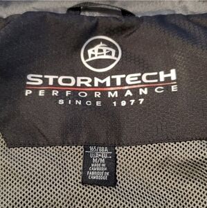 New with tags, black and granite, water repellent Stormtech jacket with two exterior side pockets, 2 interior pockets and mesh liner. Size medium.