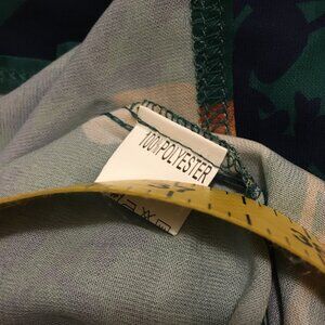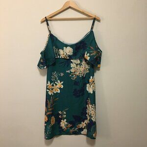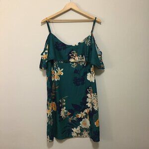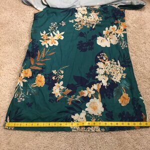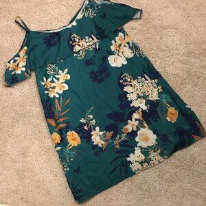 Very good unworn condition, lightweight, flutter collar, cold shoulder/strapped/sleeveless dress by YOINS in dark teal with a hint of forest green. The colours on this are gorgeous. Flowers are illustrated in white, dark navy blue, orange and mint. The textile artist has an advanced sense of colour ratio.
