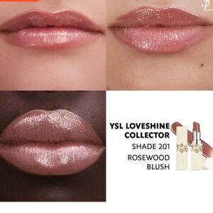 NWT- The YSL Loveshine Collector in #201 Rosewood Blush is a limited edition, high-shine lipstick featuring a special holiday-themed packaging. This collector's item combines the existing #201 shade with a unique, luxurious case designed for the festive season.