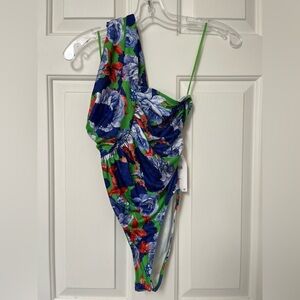 Make a statement poolside or on vacation in this stunning floral one-piece swimsuit from ZARA. Featuring a vibrant green base with bold blue, red, and white flower prints, this flattering swimsuit is designed with an asymmetrical neckline, one wide shoulder strap, and a slim green spaghetti strap for added support. Fully lined with medium coverage and slight ruching at the sides for a flattering fit.