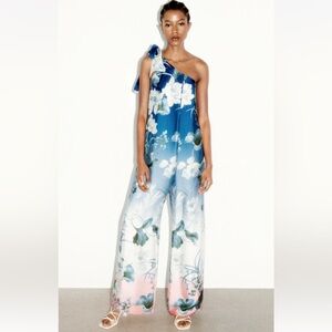 NWT ZARA Blue Floral One-Shoulder Wide Leg Jumpsuit XS