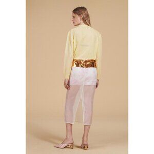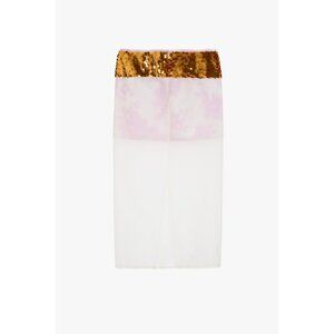 Midi skirt with a mid waist made of 100% silk. Sequin appliqué and pronounced contrast topstitching. Short interior lining in floral jacquard. Slit hem. Back hidden in-seam zip closure.
