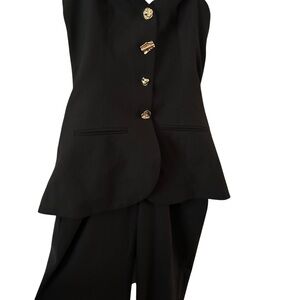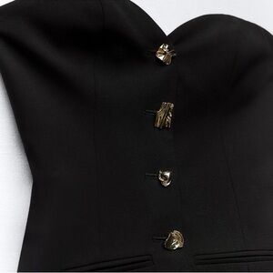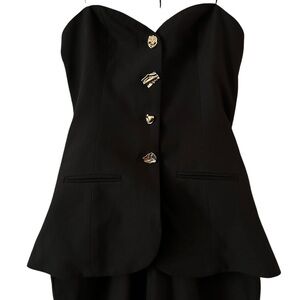 This strapless jumpsuit comes in a chic black color with gold buttons making it perfect for any occasion.