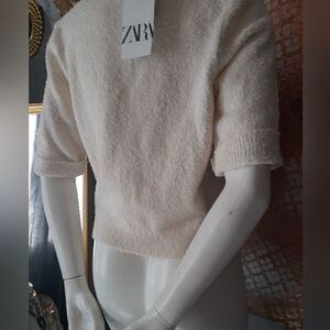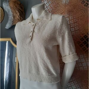 brand new, cotton blend shirt sleeved Polo style sweater from Zara. no flaws, never worn, perfect condition. pullover style with goldtone dome shaped button details. collared, textured, extra soft. cream in colour. lots of stretch. see flat lay measurements below! also, see pics for material composition!