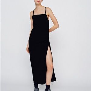 A beautiful Zara midi dress with a straight neck with spaghetti straps. Adjustable draping drawstrings at the sides. Hidden side zipper closure.