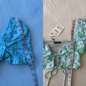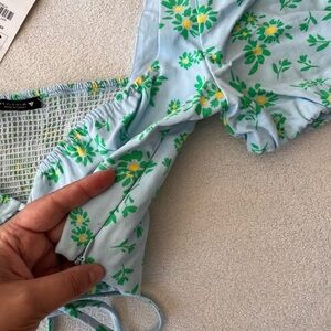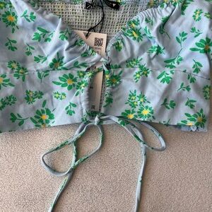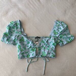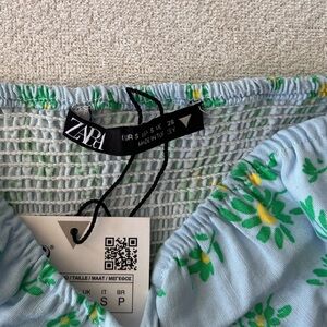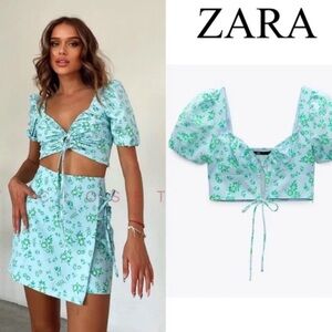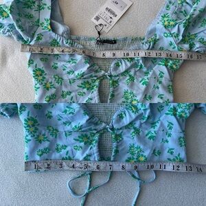 Fresh and feminine, this Zara linen blend crop top features a pastel blue base with a vibrant green and yellow floral print. Designed with short puff sleeves, a flattering sweetheart neckline, front tie detail with cut out, and ruched bust. The smocked back panel ensures a comfortable, flexible fit. Lightweight and perfect for warm-weather styling.