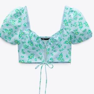 NWT Zara Floral Linen Blend Puff Sleeve Crop Top S