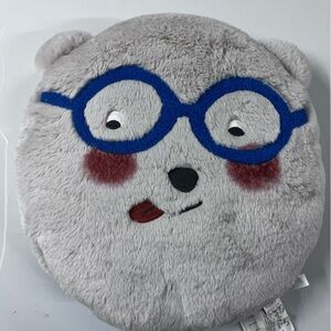 Children's faux fur filled cushion. Featuring a design in the shape of a bear with ears and embroidered glasses.