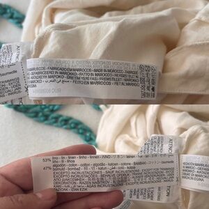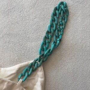 This Zara linen-blend jumpsuit features a flattering V-neckline, wide-leg silhouette, and standout chunky resin chain straps in a rich turquoise tone.