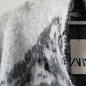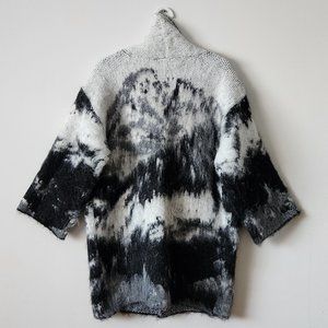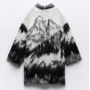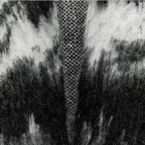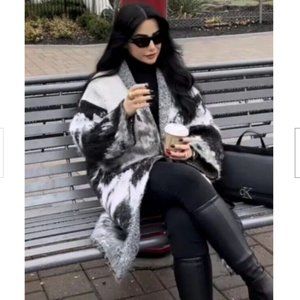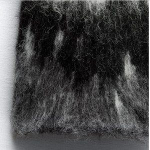 Long sleeve open front coat. Front patch pockets. Brushed effect finish.