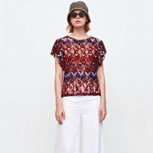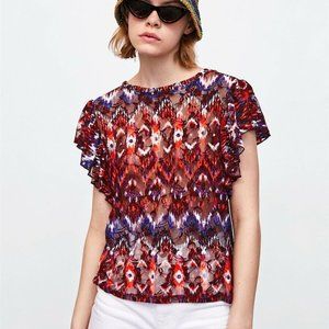 NWT - Zara Printed Lace Top Short Ruffled Sleeves
