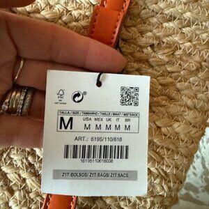This is a new with tags Zara neutral straw bag, with orange leather handles and piping. It also features silver hardware and an inside leather pocket with tags. It measures 13" width and 10" length, with lots of room for day to day purse contents.