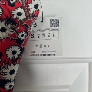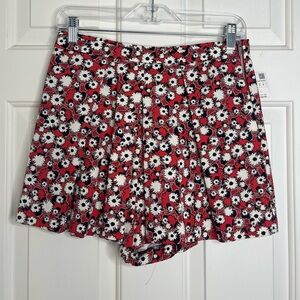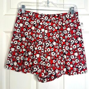 These red floral shorts are by Zara TRF & feature pleat detailing across the front & back, making it look more like a skirt than shorts. Features allover red, black & white ditzy floral print. High rise. Exposed side zip closure.