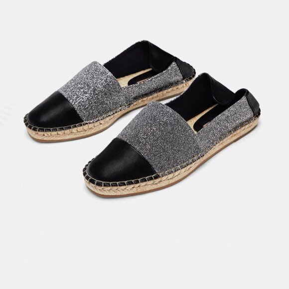 NWT Zara Basic black faux leather and grey glitter raffia espadrille flats