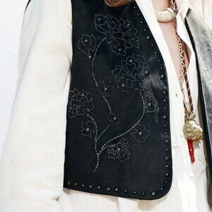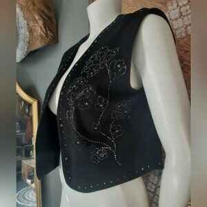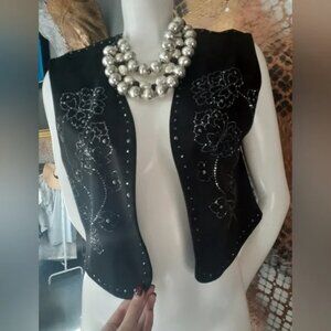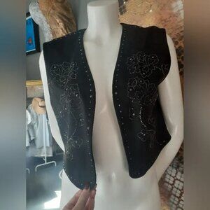 Stylish, black, faux suede vest with studded floral design. Perfect for adding an edgy touch to any outfit. Slightly cropped. See pics for full material composition. Gorgeous bejeweled studded boho floral design down the front of both sides with studded detail along hem in back. Stunning addition to any wardrobe! Size xs, can fit size s as well imo, due to open design. See flat lay measurements below!