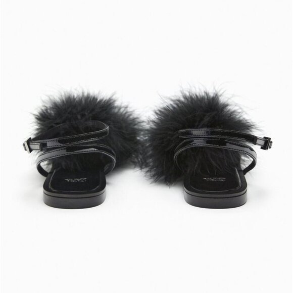 NWT Zara black feather accented flat strap up sandals, EU 36