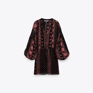 NWT Zara black, multicoloured and metallic thread paisley print boho mini dress