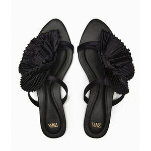 NWT Zara black pleated fabric floral detail flat sandals, EU 37