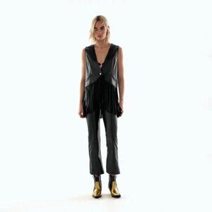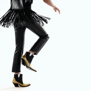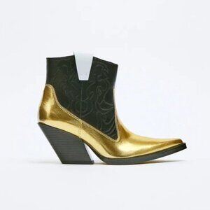 NWT Zara Trafaluc black & shiny gold faux leather cowboy ankle boot w/ black stitching accent