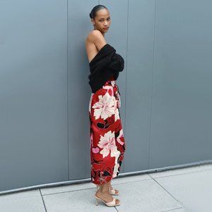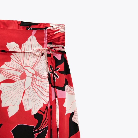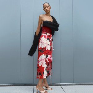 NWT Zara red multicoloured floral print split front high waisted midi skirt