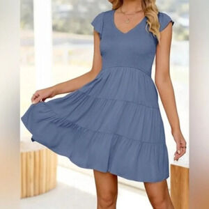 NWT Zesica shirred bodice tiered skirt short sleeve dress dusty blue v-neck S