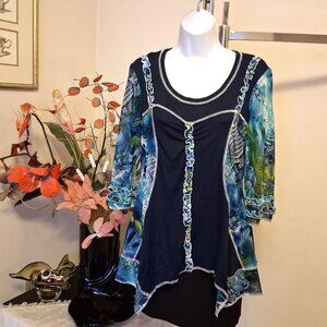 NWT Zoe Women's Navy-Blue Teal Patchwork Design Blouse ¾ Sleeve Top Size 10 M