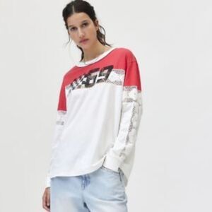 BDG long sleeve top updated in a spliced, mixed-material style. Designed with a crew neckline, color blocking and lace insets at the chest & sleeves. Topped with a racing graphic for sporty flair.