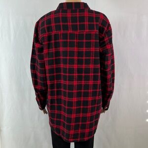 It features allover red and black plaid with chest flap pockets, long sleeves, side seam hand pockets and a spread collar.